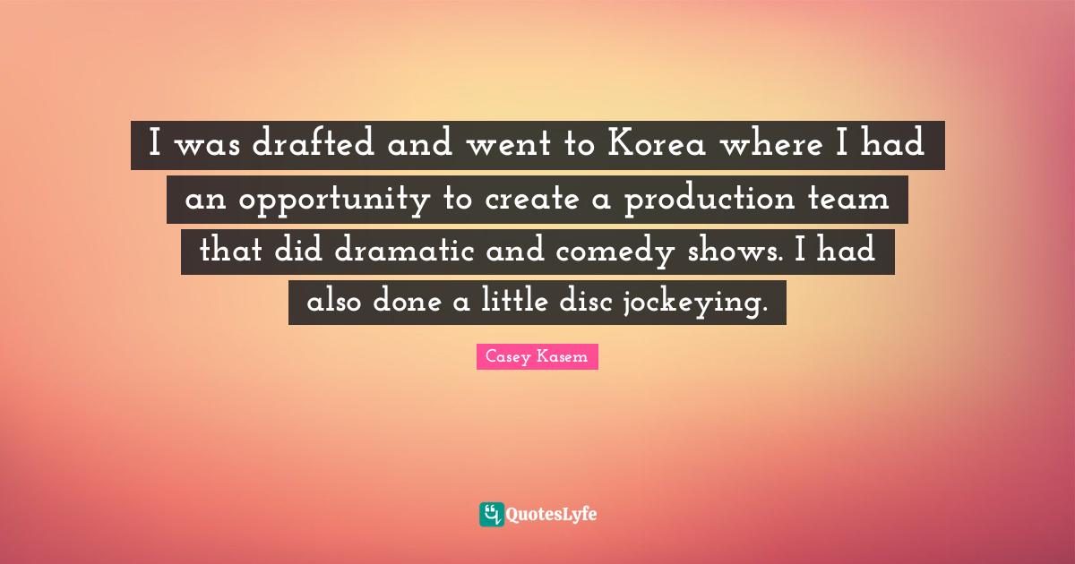 This page presents the quote "I was drafted and went to Korea where I had an opportunity to create a production team that did dramatic and comedy shows. I had also done a little disc jockeying.". Author of this quote is Casey Kasem. This quote is about dramatic, comedy, korea, team, shows, opportunity, done,.