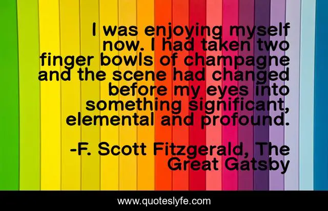 This page presents the quote "I was enjoying myself now. I had taken two finger bowls of champagne and the scene had changed before my eyes into something significant, elemental and profound.". Author of this quote is F. Scott Fitzgerald, The Great Gatsby. .
