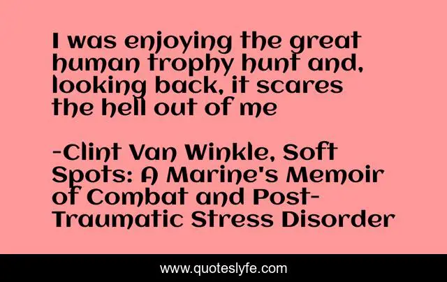This page presents the quote "I was enjoying the great human trophy hunt and, looking back, it scares the hell out of me". Author of this quote is Clint Van Winkle, Soft Spots: A Marine's Memoir of Combat and Post-Traumatic Stress Disorder. This quote is about hunt, scare, human, war,.