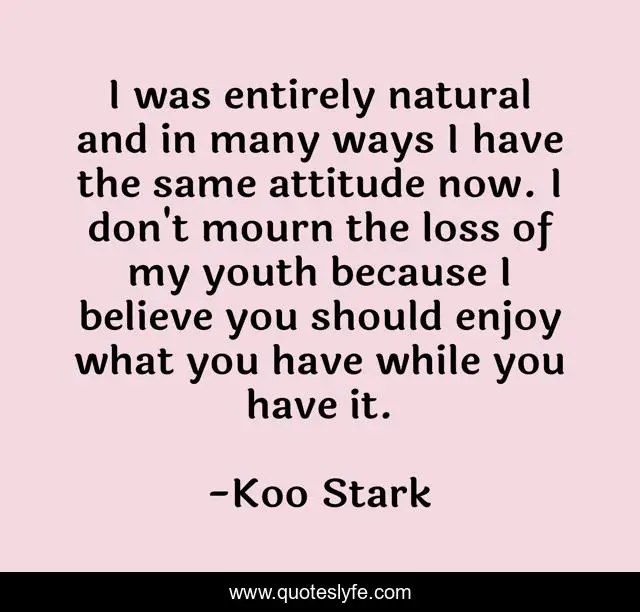 This page presents the quote "I was entirely natural and in many ways I have the same attitude now. I don't mourn the loss of my youth because I believe you should enjoy what you have while you have it.". Author of this quote is Koo Stark. This quote is about youth, loss, believe,.
