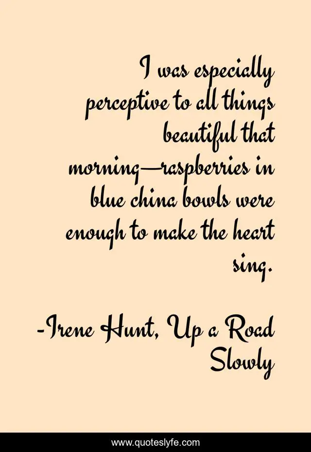 "Irene Hunt, Up a Road Slowly Quotes." Quoteslyfe.com, 2025. Mon. 08 Dec. 2025. <https://www.quoteslyfe.com/quote/I-was-especially-perceptive-to-all-things-246226>.
