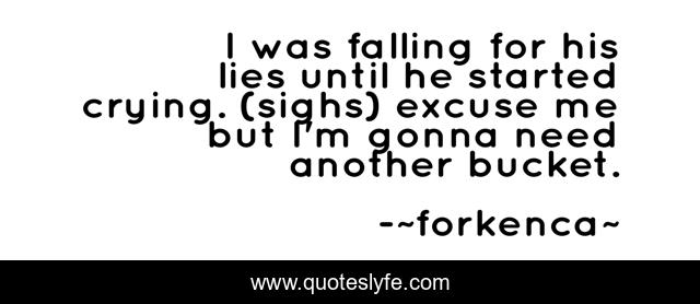 This page presents the quote "I was falling for his lies until he started crying. (sighs) excuse me but I'm gonna need another bucket.". Author of this quote is ~forkenca~. This quote is about falling, bucket, crying,.
