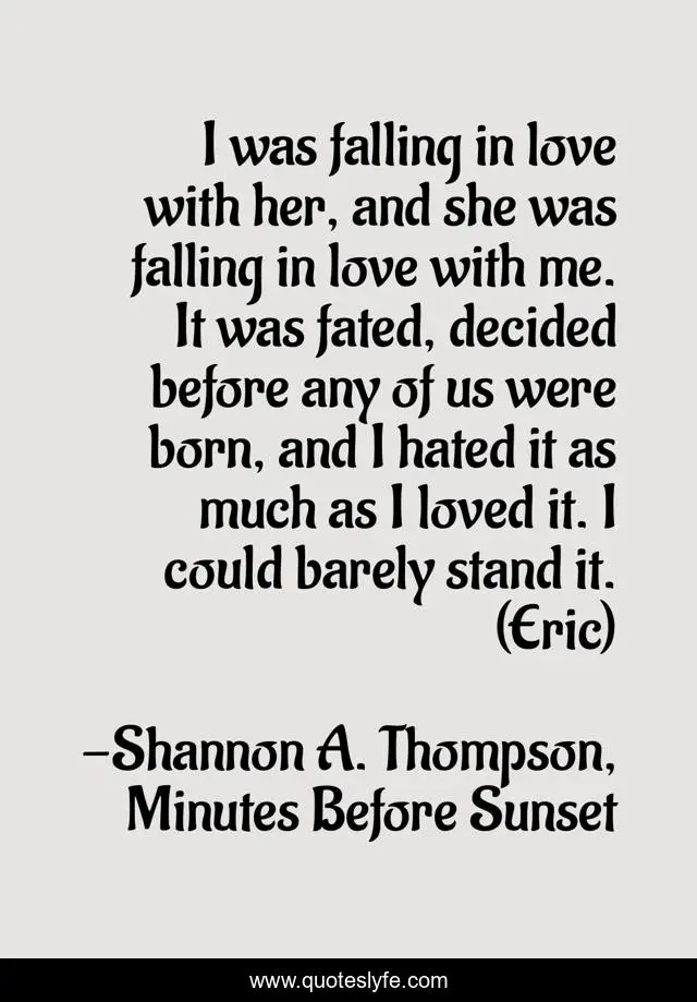 This page presents the quote "I was falling in love with her, and she was falling in love with me. It was fated, decided before any of us were born, and I hated it as much as I loved it. I could barely stand it. (Eric)". Author of this quote is Shannon A. Thompson, Minutes Before Sunset. This quote is about falling-in-love, love, destiny, fate, choice, romance, young-love, hate-to-love, paranormal-romance,.