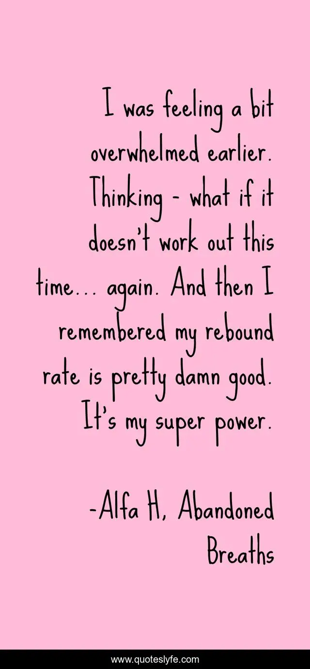 This page presents the quote "I was feeling a bit overwhelmed earlier. Thinking - what if it doesn't work out this time... again. And then I remembered my rebound rate is pretty damn good. It's my super power.". Author of this quote is Alfa H, Abandoned Breaths. This quote is about relationships, life, love, poetry, affection,.