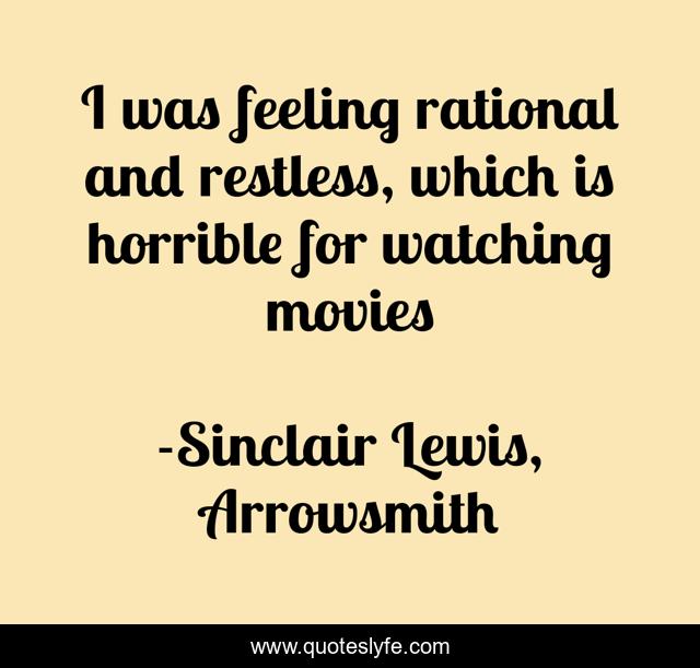 This page presents the quote "I was feeling rational and restless, which is horrible for watching movies". Author of this quote is Sinclair Lewis, Arrowsmith. This quote is about lessons, life, restless, quotes, arrowsmith, lit, movies,.