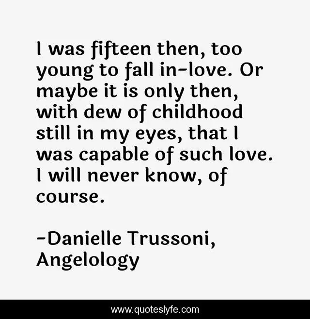 This page presents the quote "I was fifteen then, too young to fall in-love. Or maybe it is only then, with dew of childhood still in my eyes, that I was capable of such love. I will never know, of course.". Author of this quote is Danielle Trussoni, Angelology. This quote is about angels, amazing-book,.
