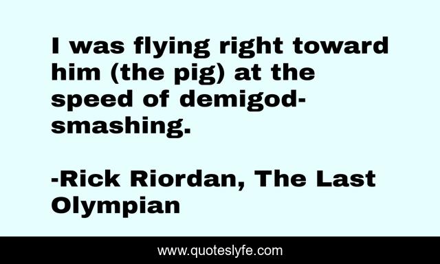 This page presents the quote "I was flying right toward him (the pig) at the speed of demigod-smashing.". Author of this quote is Rick Riordan, The Last Olympian. .