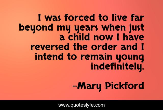 This page presents the quote "I was forced to live far beyond my years when just a child now I have reversed the order and I intend to remain young indefinitely.". Author of this quote is Mary Pickford. .
