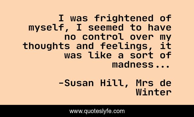 This page presents the quote "I was frightened of myself, I seemed to have no control over my thoughts and feelings, it was like a sort of madness...". Author of this quote is Susan Hill, Mrs de Winter. This quote is about control, madness, thoughts, feelings,.