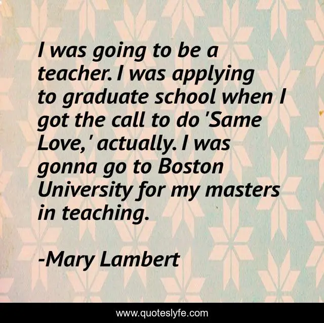 This page presents the quote "I was going to be a teacher. I was applying to graduate school when I got the call to do 'Same Love, ' actually. I was gonna go to Boston University for my masters in teaching.". Author of this quote is Mary Lambert. This quote is about boston, school, love, affection,.