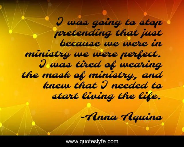This page presents the quote "I was going to stop pretending that just because we were in ministry we were perfect. I was tired of wearing the mask of ministry, and knew that I needed to start living the life.". Author of this quote is Anna Aquino. This quote is about perfect, life, ministry, a-marriage-in-time, mask, christianity, pretension, church,.