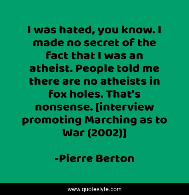 This page presents the quote "I was hated, you know. I made no secret of the fact that I was an atheist. People told me there are no atheists in fox holes. That's nonsense. [interview promoting Marching as to War (2002)]". Author of this quote is Pierre Berton. This quote is about atheism, hate,.