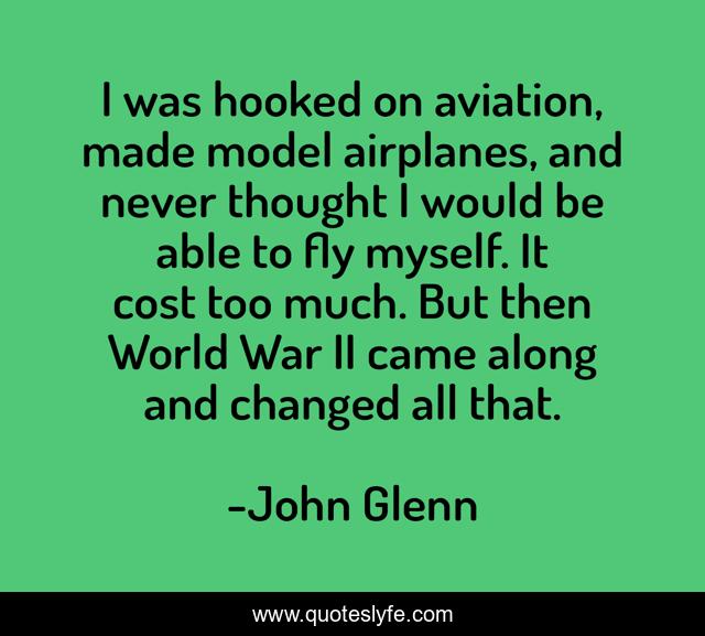 This page presents the quote "I was hooked on aviation, made model airplanes, and never thought I would be able to fly myself. It cost too much. But then World War II came along and changed all that.". Author of this quote is John Glenn. This quote is about fly, world, myself,.