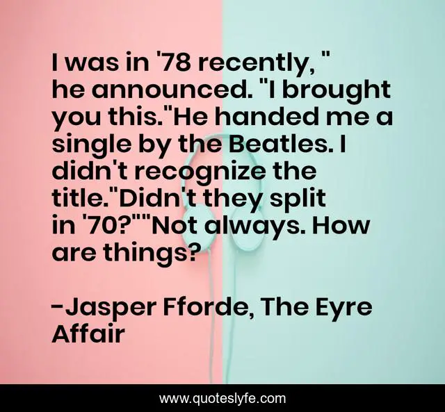 This page presents the quote "I was in '78 recently, " he announced. "I brought you this."He handed me a single by the Beatles. I didn't recognize the title."Didn't they split in '70?""Not always. How are things?". Author of this quote is Jasper Fforde, The Eyre Affair. .