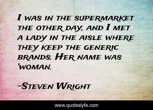 This page presents the quote "I was in the supermarket the other day, and I met a lady in the aisle where they keep the generic brands. Her name was 'woman.". Author of this quote is Steven Wright. This quote is about humor, women,.