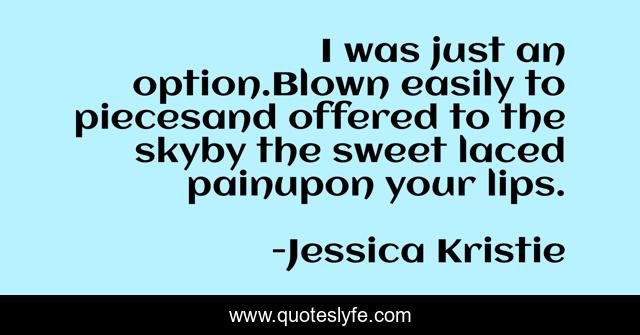 This page presents the quote "I was just an option.Blown easily to piecesand offered to the skyby the sweet laced painupon your lips.". Author of this quote is Jessica Kristie. This quote is about poems-on-life, poetry, poetry-life, poetry-love, poems, micropoetry,.