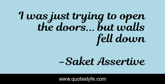 This page presents the quote "I was just trying to open the doors... but walls fell down". Author of this quote is Saket Assertive. This quote is about life, phylosophy, door, walls, relationship,.
