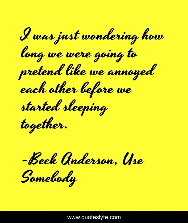This page presents the quote "I was just wondering how long we were going to pretend like we annoyed each other before we started sleeping together.". Author of this quote is Beck Anderson, Use Somebody. This quote is about funny, contemporary-romance, fly-fishing, alpha-male, romance, romantic-comedy, comedy, idaho,.