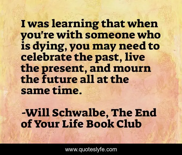 This page presents the quote "I was learning that when you're with someone who is dying, you may need to celebrate the past, live the present, and mourn the future all at the same time.". Author of this quote is Will Schwalbe, The End of Your Life Book Club. This quote is about memories, death, dying, time,.