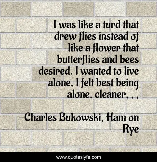 This page presents the quote "I was like a turd that drew flies instead of like a flower that butterflies and bees desired. I wanted to live alone, I felt best being alone, cleaner, , , ". Author of this quote is Charles Bukowski, Ham on Rye. .