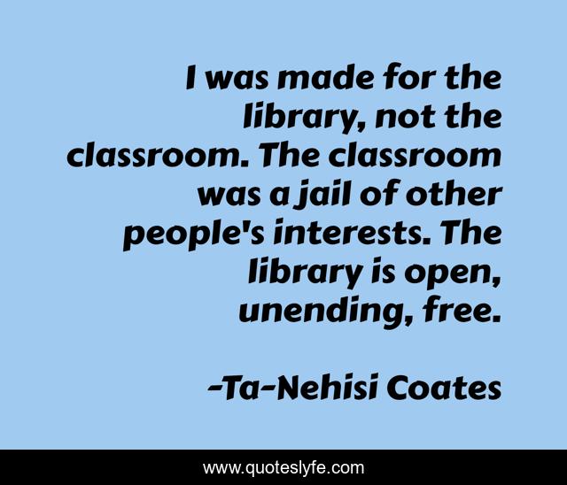 This page presents the quote "I was made for the library, not the classroom. The classroom was a jail of other people's interests. The library is open, unending, free.". Author of this quote is Ta-Nehisi Coates. This quote is about libraries, classrooms,.
