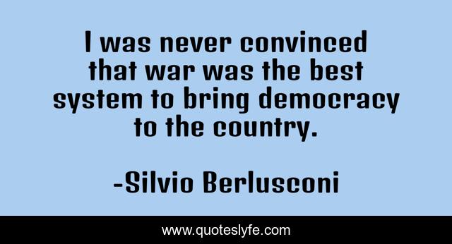 This page presents the quote "I was never convinced that war was the best system to bring democracy to the country.". Author of this quote is Silvio Berlusconi. This quote is about country, best, democracy,.