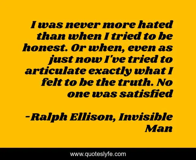 This page presents the quote "I was never more hated than when I tried to be honest. Or when, even as just now I've tried to articulate exactly what I felt to be the truth. No one was satisfied". Author of this quote is Ralph Ellison, Invisible Man. This quote is about enthusiasm, inspirational,.