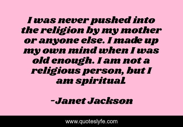 This page presents the quote "I was never pushed into the religion by my mother or anyone else. I made up my own mind when I was old enough. I am not a religious person, but I am spiritual.". Author of this quote is Janet Jackson. This quote is about spiritual, mother,.
