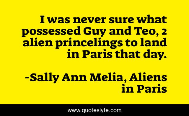 This page presents the quote "I was never sure what possessed Guy and Teo, 2 alien princelings to land in Paris that day.". Author of this quote is Sally Ann Melia, Aliens in Paris. This quote is about humour, science-fiction,.