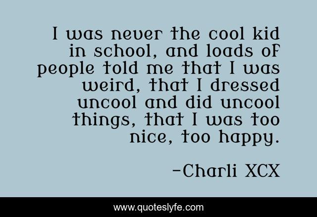 This page presents the quote "I was never the cool kid in school, and loads of people told me that I was weird, that I dressed uncool and did uncool things, that I was too nice, too happy.". Author of this quote is Charli XCX. This quote is about me, school, happy,.