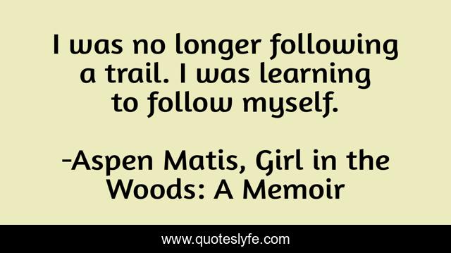 This page presents the quote "I was no longer following a trail. I was learning to follow myself.". Author of this quote is Aspen Matis, Girl in the Woods: A Memoir. This quote is about trail, aspen-matis, memoir, hiking, wisdom,.
