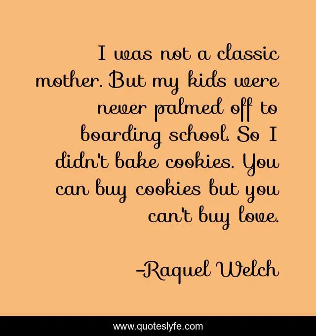 This page presents the quote "I was not a classic mother. But my kids were never palmed off to boarding school. So I didn't bake cookies. You can buy cookies but you can't buy love.". Author of this quote is Raquel Welch. This quote is about self, knowledge,.
