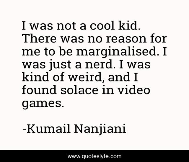 This page presents the quote "I was not a cool kid. There was no reason for me to be marginalised. I was just a nerd. I was kind of weird, and I found solace in video games.". Author of this quote is Kumail Nanjiani. This quote is about me, weird, video games,.