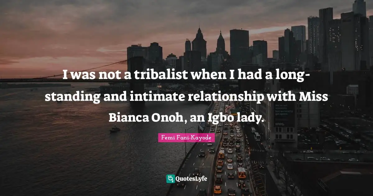 This page presents the quote "I was not a tribalist when I had a long-standing and intimate relationship with Miss Bianca Onoh, an Igbo lady.". Author of this quote is Femi Fani-Kayode. This quote is about missing, intimate, relationship, standing, intimate relationships, long,.