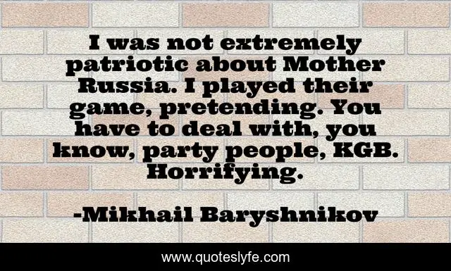 This page presents the quote "I was not extremely patriotic about Mother Russia. I played their game, pretending. You have to deal with, you know, party people, KGB. Horrifying.". Author of this quote is Mikhail Baryshnikov. This quote is about communism, kgb, humor, russia,.