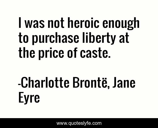 This page presents the quote "I was not heroic enough to purchase liberty at the price of caste.". Author of this quote is Charlotte Brontë, Jane Eyre. This quote is about heroism, liberty,.