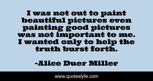 This page presents the quote "I was not out to paint beautiful pictures even painting good pictures was not important to me. I wanted only to help the truth burst forth.". Author of this quote is Alice Duer Miller. This quote is about beautiful, good, help,.