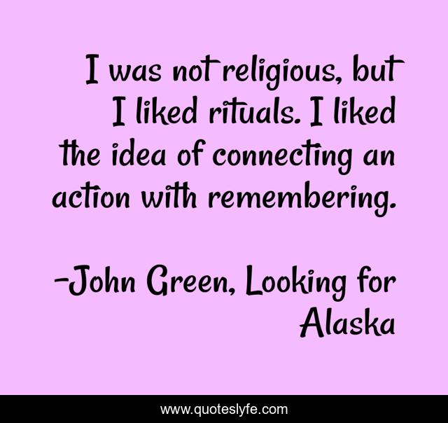 This page presents the quote "I was not religious, but I liked rituals. I liked the idea of connecting an action with remembering.". Author of this quote is John Green, Looking for Alaska. This quote is about religion, rememberance,.