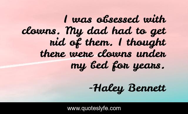 This page presents the quote "I was obsessed with clowns. My dad had to get rid of them. I thought there were clowns under my bed for years.". Author of this quote is Haley Bennett. This quote is about thought, bed, years,.