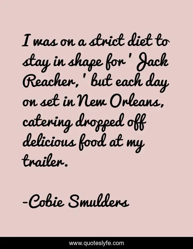 This page presents the quote "I was on a strict diet to stay in shape for 'Jack Reacher, ' but each day on set in New Orleans, catering dropped off delicious food at my trailer.". Author of this quote is Cobie Smulders. This quote is about food, new, day,.