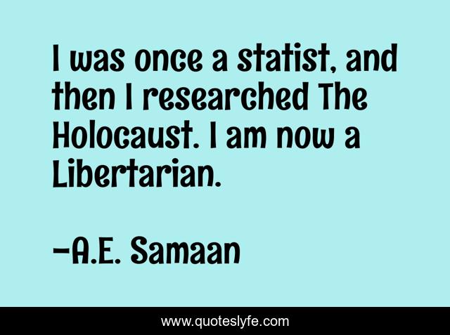 This page presents the quote "I was once a statist, and then I researched The Holocaust. I am now a Libertarian.". Author of this quote is A.E. Samaan. This quote is about libertarianism, statism, holocaust, holocaust-history, american-politics, liberty, libertarian, republican, statist,.