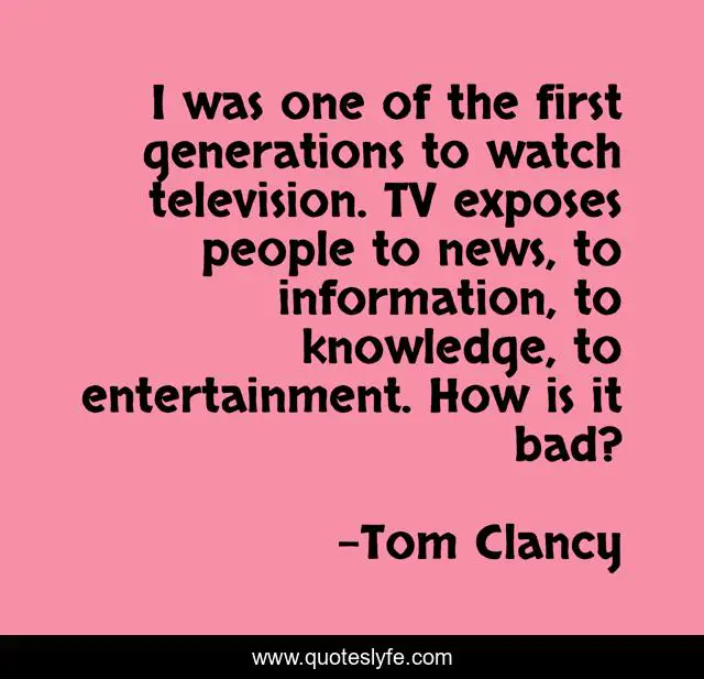 This page presents the quote "I was one of the first generations to watch television. TV exposes people to news, to information, to knowledge, to entertainment. How is it bad?". Author of this quote is Tom Clancy. This quote is about television, people,.