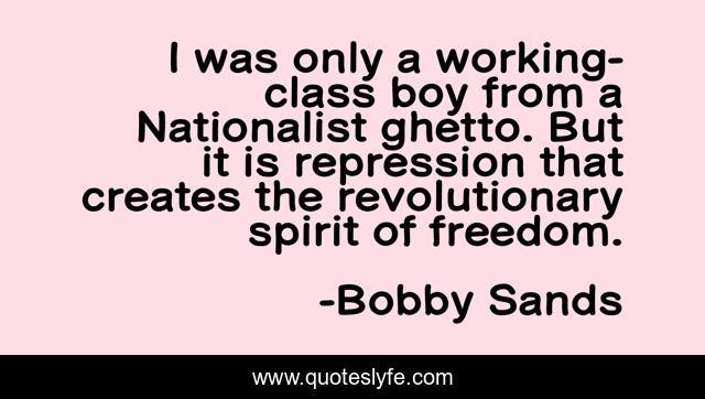 This page presents the quote "I was only a working-class boy from a Nationalist ghetto. But it is repression that creates the revolutionary spirit of freedom.". Author of this quote is Bobby Sands. This quote is about boy, spirit, ghetto,.