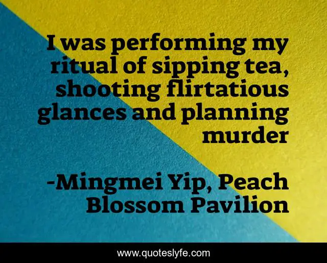 This page presents the quote "I was performing my ritual of sipping tea, shooting flirtatious glances and planning murder". Author of this quote is Mingmei Yip, Peach Blossom Pavilion. This quote is about courtesan, coquettish, geisha, revenge, funny, china, comedy, decadence,.