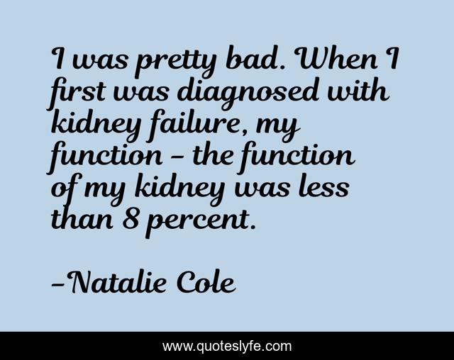 This page presents the quote "I was pretty bad. When I first was diagnosed with kidney failure, my function - the function of my kidney was less than 8 percent.". Author of this quote is Natalie Cole. This quote is about bad, kidney, first,.