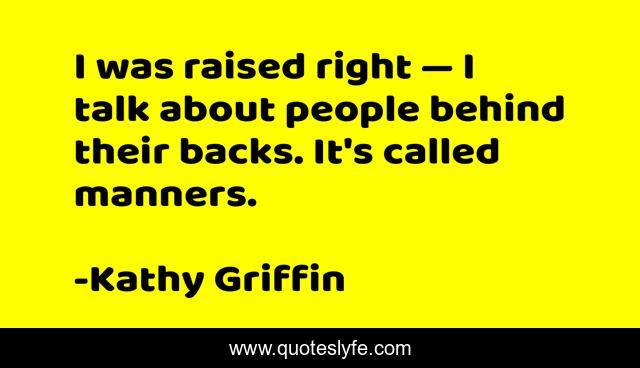This page presents the quote "I was raised right — I talk about people behind their backs. It's called manners.". Author of this quote is Kathy Griffin. This quote is about etiquette, humor, manners,.