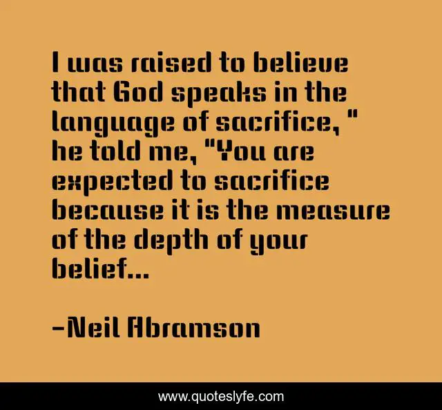 This page presents the quote "I was raised to believe that God speaks in the language of sacrifice, " he told me, "You are expected to sacrifice because it is the measure of the depth of your belief...". Author of this quote is Neil Abramson. This quote is about grief, sacrifice, religious, belief,.