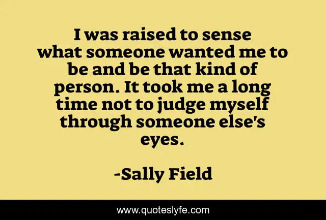 This page presents the quote "I was raised to sense what someone wanted me to be and be that kind of person. It took me a long time not to judge myself through someone else's eyes.". Author of this quote is Sally Field. .