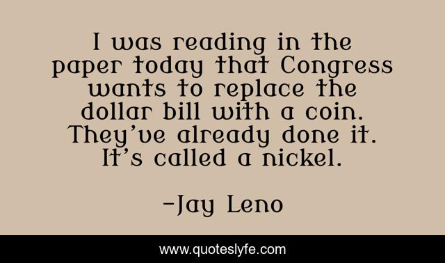 This page presents the quote "I was reading in the paper today that Congress wants to replace the dollar bill with a coin. They’ve already done it. It’s called a nickel.". Author of this quote is Jay Leno. This quote is about scam, money, libertarian, collectivism, coercion, crisis, communism, liberty, voluntaryism,.