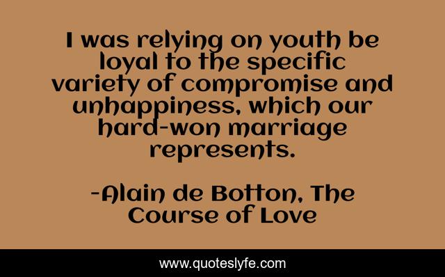 This page presents the quote "I was relying on youth be loyal to the specific variety of compromise and unhappiness, which our hard-won marriage represents.". Author of this quote is Alain de Botton, The Course of Love. This quote is about marriage, loyalty,.